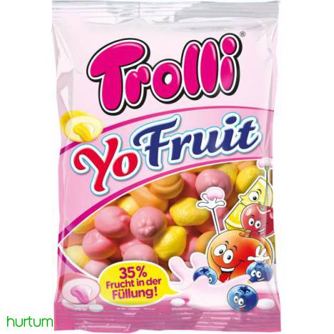 Żelki Trolli YOFRUIT. MIX żelek w kształcie owocków. Jogurtowe z nadzieniem o smaku owocowym. Opakowanie woreczek foliowy. Waga netto 200 g. Producent: NIEMCY